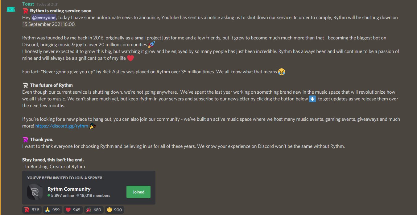 Youtube Shuts Down Another Discord Music Bot Rythm Music Ally